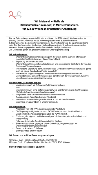 Wir suchen zum 1.4.2026 eine(n) Kirchenmusiker:in (w/m/d). Die Stelle ist nicht befristet und umfasst 12,5 Wochenstunden.