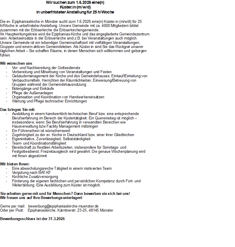 Wir suchen zum 1.6.2026 eine(n) Küster.in (m/w/d) in unberfristeter Anstellung für 25 h/Woche. Du hast eine handwerkliche/technische Ausbildung (oder Vergleichbares), organisierst und kommunizierst gerne, kannst "mit anpacken" und hast Spaß an einer sehr abwechslungsreichen Arbeit? Dann schau dir hier die Stellenbeschreibung an und bewirb dich bis zum 31.3.2026.
