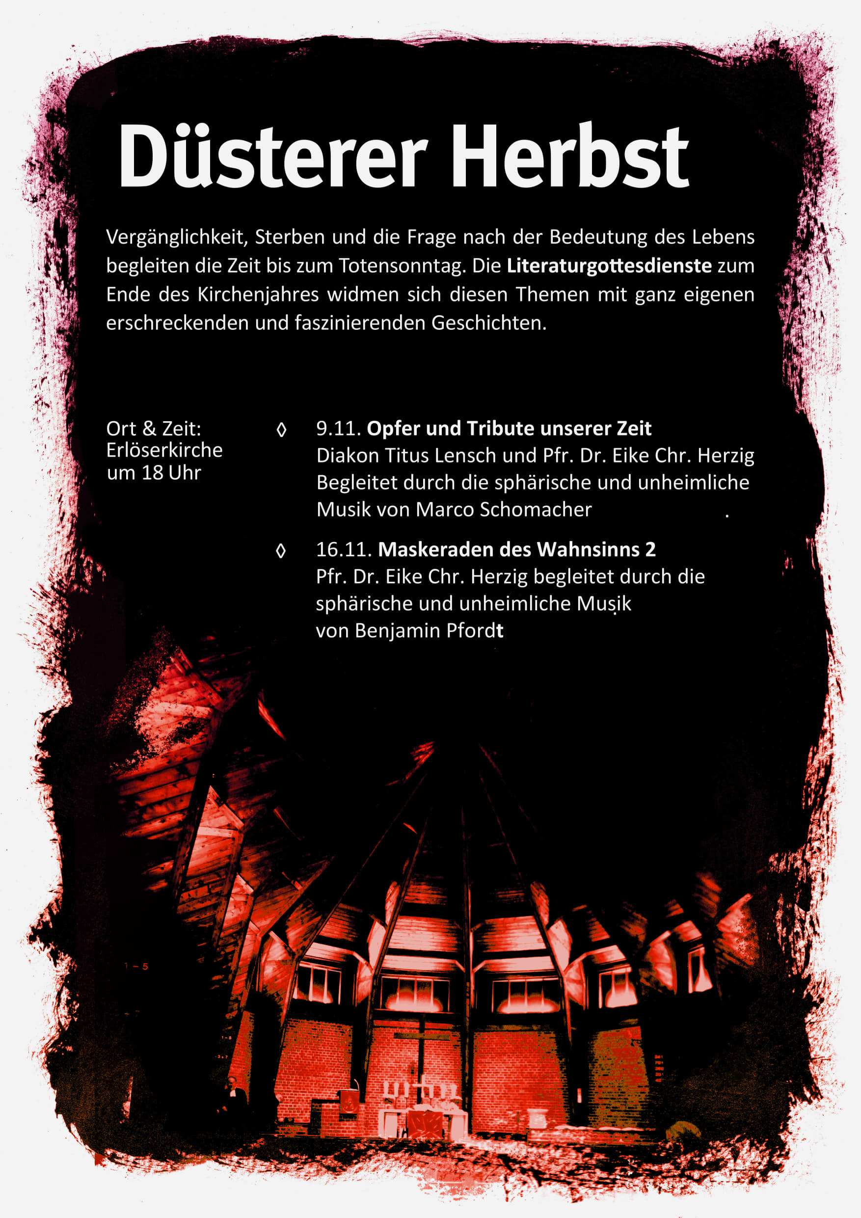 Vergänglichkeit, Sterben und die Frage nach der Bedeutung des Lebens begleiten die Zeit bis zum Totensonntag. Die Literaturgottesdienste zum Ende des Kirchenjahres widmen sich diesen Themen mit ganz eigenen erschreckenden und faszinierenden Geschichten.
