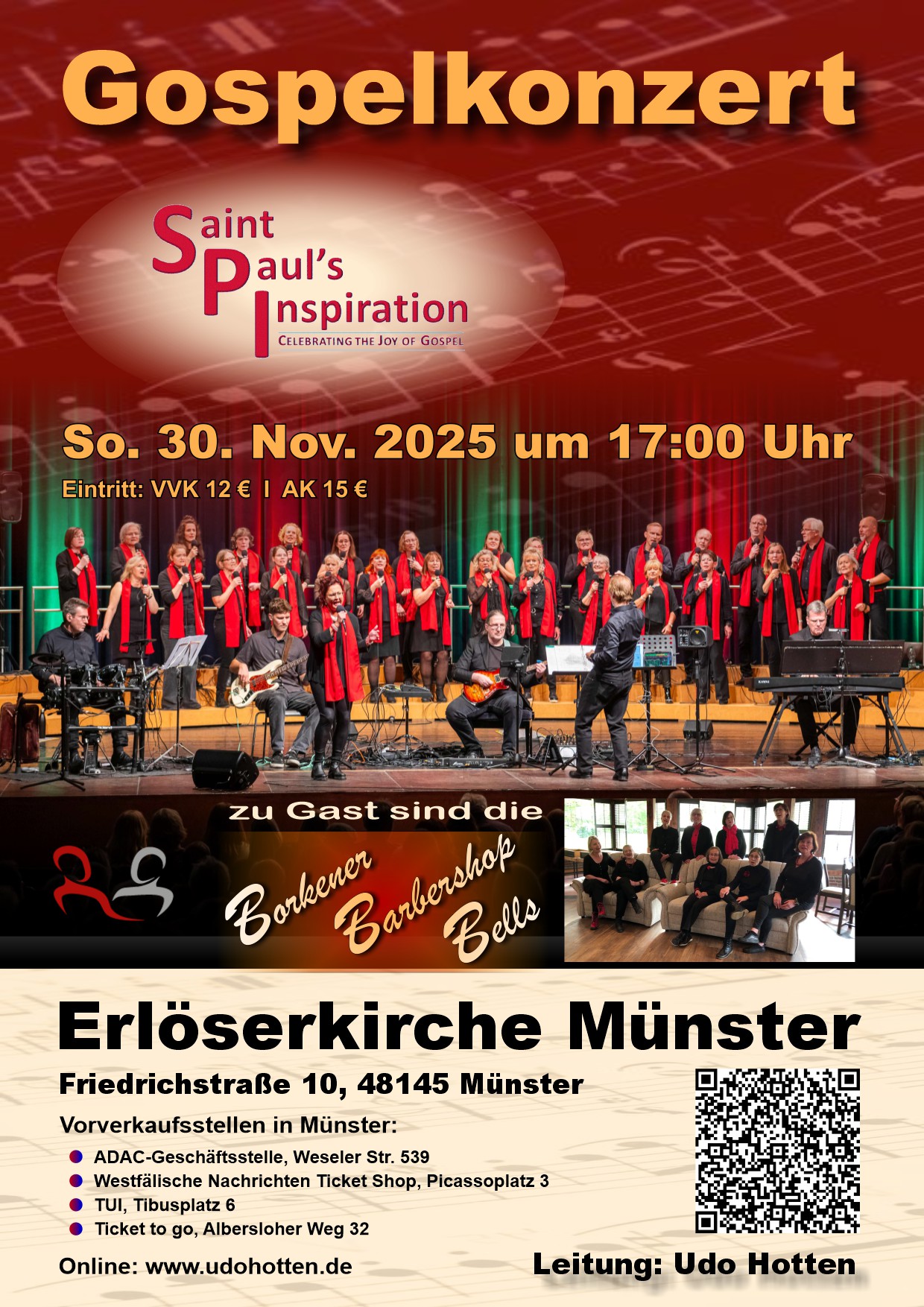 Am 30.11.2025 um 17:00 Uhr lädt der Gospelchor Saint Paul’s Inspiration zu einem inspirierenden Konzert in die Erlöserkirche Münster (Friedrichstraße 10) ein.