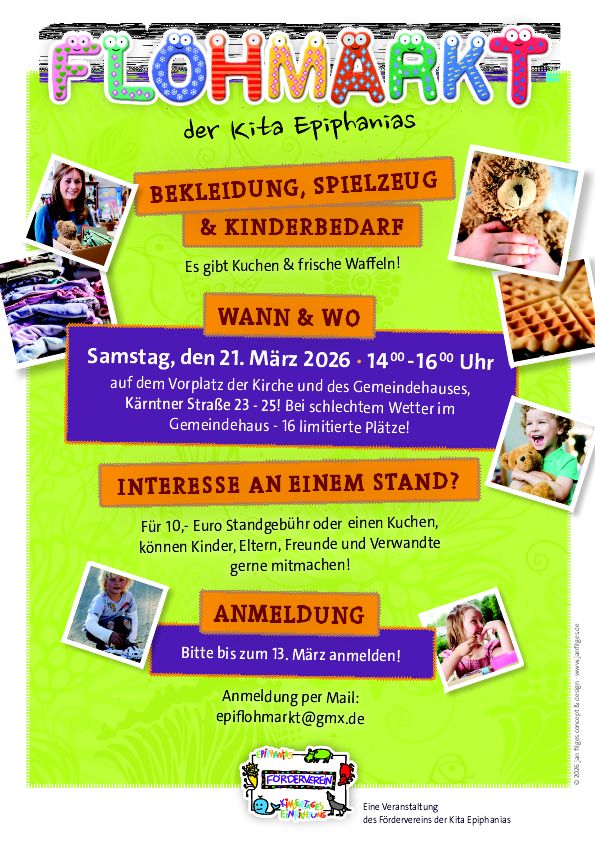 Der Flohmarkt findet von 14.00 bis 16.00 Uhr auf dem Kirchplatz vor der Epiphaniaskirche und dem Treffpunkt für Alt und Jung an der Kärntner Str. 23-25 statt.